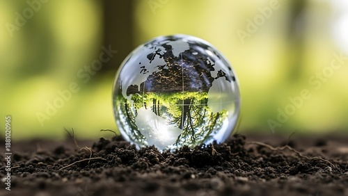 A glass globe reflecting a forest, planted on soil, symbolizing environmental stewardship