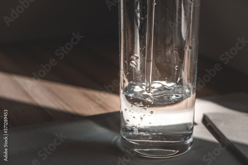 a glass is filled with crystal clear water in the morning sun. a glass of water in the morning. healthy eating, health care