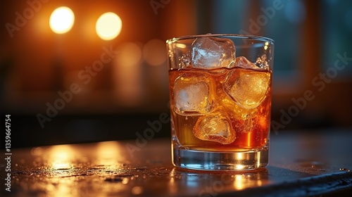 A glass of amber-colored beverage with ice cubes, set against a warmly lit background.