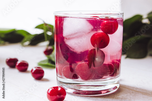 A glass of cherry drink with ice in a glass on a white wooden background. Fresh summer cocktail with cherries and ice cubes.