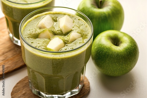 a glass of green apple healthy smoothie put next to fresh green apples