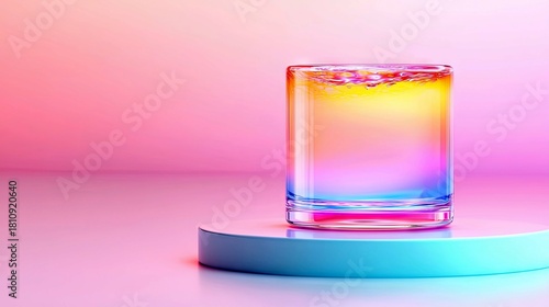 A glass of liquid with a rainbow gradient is displayed on a pastel blue pedestal against a soft pink and yellow gradient background.