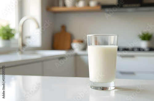 A glass of milk stands on a white table and a modern white kitchen is blurred in the background.