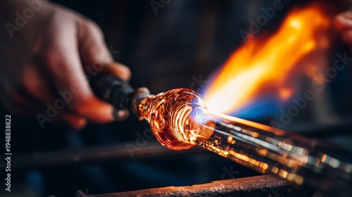 A glassblower shaping molten glass tube using torch flame.