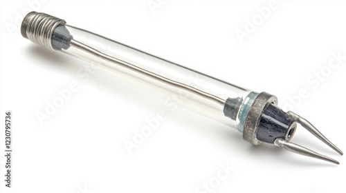 A glass-encased capacitor with silver legs, isolated on a classic white background.