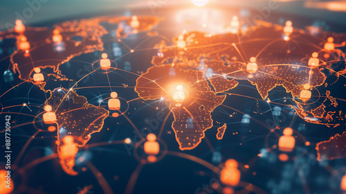 A global business network structure utilizing virtual interface icons and internet technology, focusing on regulatory compliance.