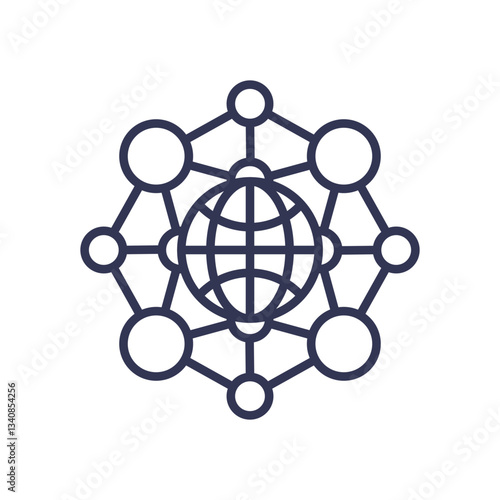 A globe surrounded by interconnected nodes symbolizes global interconnectedness.