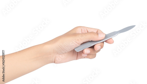A gloved hand holds a sliver-shaped, light gray tool isolated on solid white background Png format