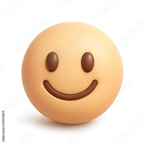 A glowing 3D smiley face emoji, cream-colored with brown eyes and a smooth smile, radiating happiness on a dark background. This friendly, optimistic digital icon symbolizes joy, positive emotion for