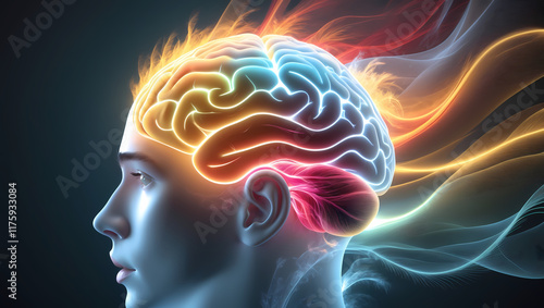 A glowing brain emitting dynamic golden and mint green waves in a detailed head profile, set against a soft, dark backdrop.