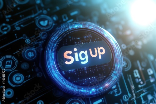 A glowing button with the text 'Sign up' on a digital interface, symbolizing online registration and opportunities.