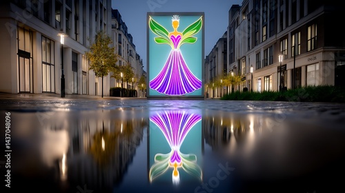 A glowing, colorful, winged figure in a dress is displayed on a city street, reflected in a puddle