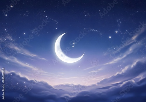 A glowing crescent moon shines brightly amidst a starry night sky