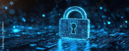 A glowing digital padlock symbolizes cybersecurity and data protection in a high-tech, futuristic environment.