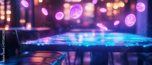 A glowing dining table with floating neon coins creates vibrant atmosphere