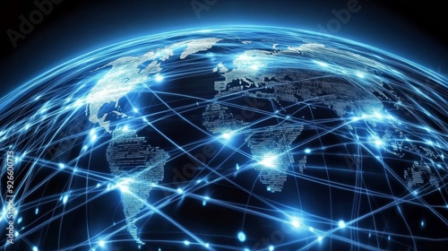 A glowing earth with interconnected lines symbolizing global communication, network infrastructure, data transfer, internet connectivity, and technological advancement.
