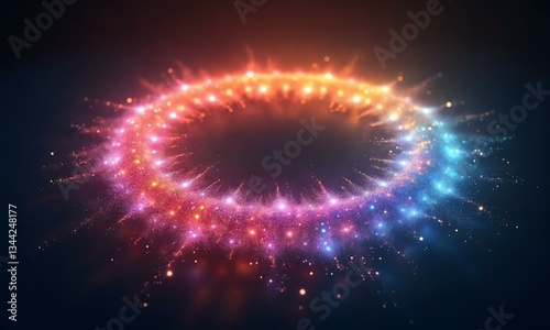 A glowing fractal ring made of rainbow-colored particles, pulsating with vibrant light, forming an abstract digital halo.