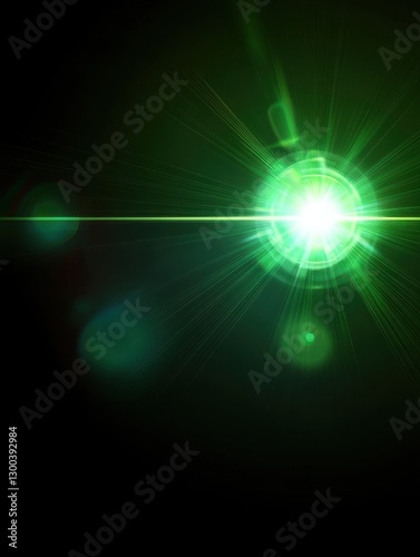 A glowing green light with lens flare on black background