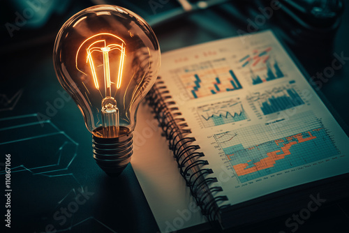 A glowing light bulb hovering over an open notebook filled with sketches and graphs with copy space. Bright focused light. Minimalist desk background.