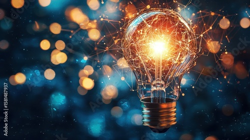 A glowing light bulb with a network of connections against a blue and orange bokeh background.