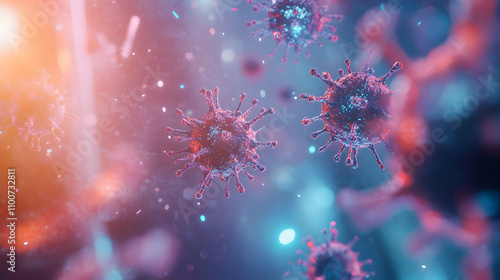 A glowing microscopic representation of viruses in blue and red hues, floating in a misty, illuminated background.