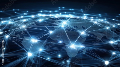 A glowing network of lines and dots connects the continents of the world, symbolizing global connectivity.