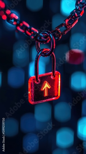 A glowing red padlock with an upward arrow hangs on a chain, set against a blurred blue background, creating a modern and striking visual.