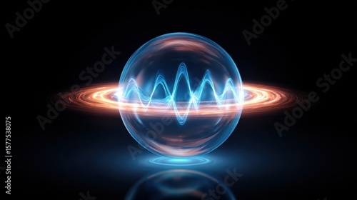 A glowing sphere surrounded by wave patterns emits a futuristic, high-tech vibe, suggesting themes of energy and sound.