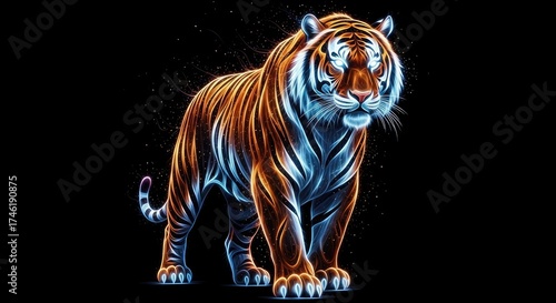 A glowing tiger with vibrant colors stands prominently against a black backdrop.