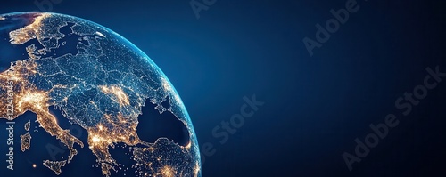 A glowing view of Earth showcasing illuminated cities against a dark background, highlighting geographical features and the interconnectedness of human civilization.