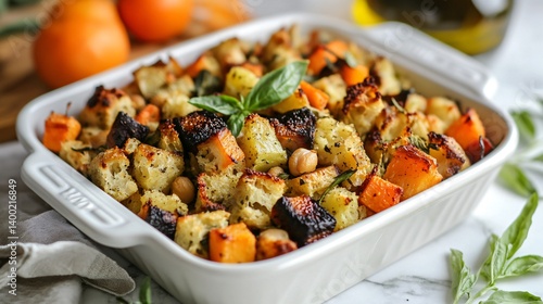 A gluten-free stuffing made with chickpeas, roasted vegetables, and fresh basil, beautifully plated with olive oil drizzled on top