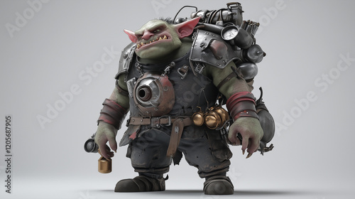 A goblin clad in armor made of discarded pots and pans, with a spring-loaded contraption strapped to their back. Videogame 3D model, A-pose, simple background