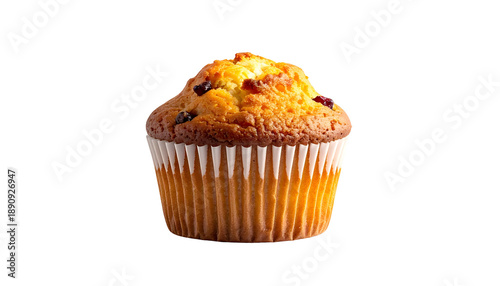 A golden, freshly baked muffin in a paper liner, isolated on a black background