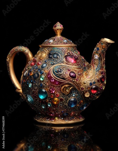 A golden teapot, adorned with a dazzling array of colorful gemstones, reflects elegance and opulence in its intricate design.