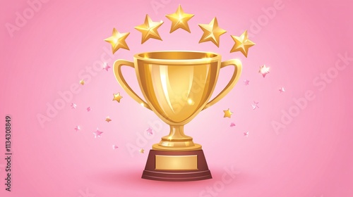 A golden trophy with five shining stars against a pink background, symbolizing achievement and success.