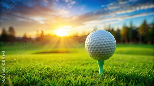 A golf ball on a tee at sunset on a lush green course