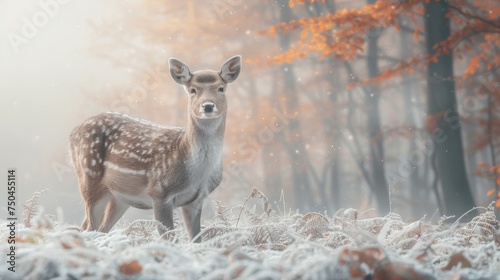 A graceful white deer roams among the green forest. The beauty of brown natural wildlife