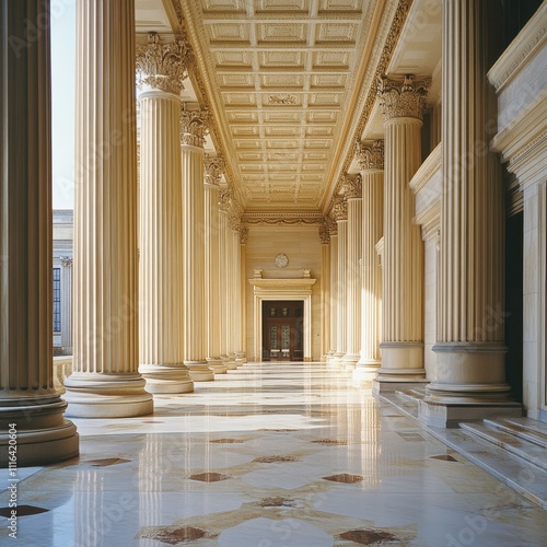 A grand corridor featuring elegant columns and a polished marble floor, ideal for architectural presentations, historical references, or interior design concepts showcasing luxury and sophistication,