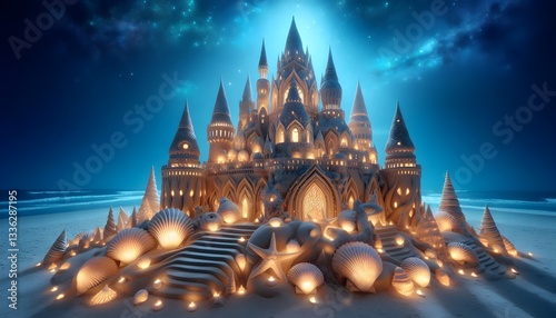 A grand enchanted sandcastle, glowing with seashell lights, set on a dreamy moonlit beach.