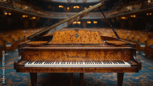 A grand piano sits on stage in an empty concert hall, awaiting a performance.