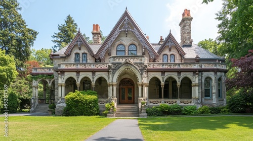 A grand Victorian-style mansion with intricate architecture and lush greenery.