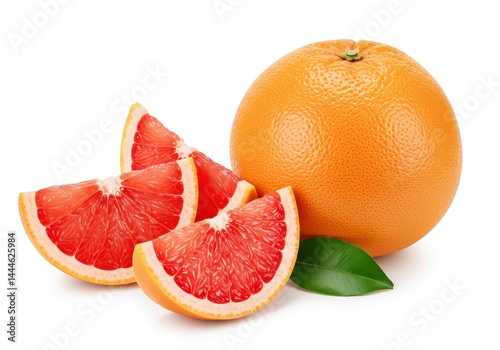 A grapefruit and grapefruit slices arranged with a green leaf on a white background in a studio shot