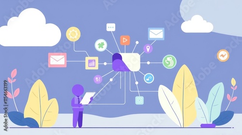 A graphic depicting digital communication and connections through various icons and a figure.