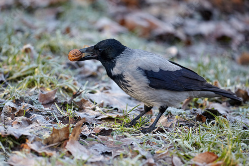 A gray crow in the winter park with a nut in its beak