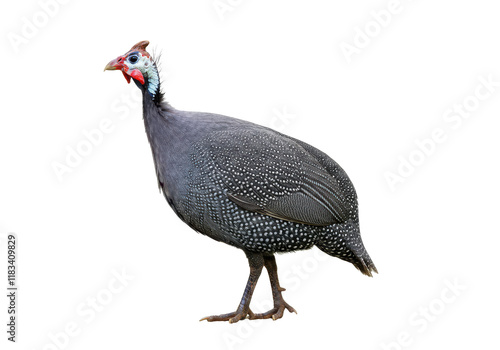 A gray guinea fowl with a red and white face, standing upright, isolated on white background