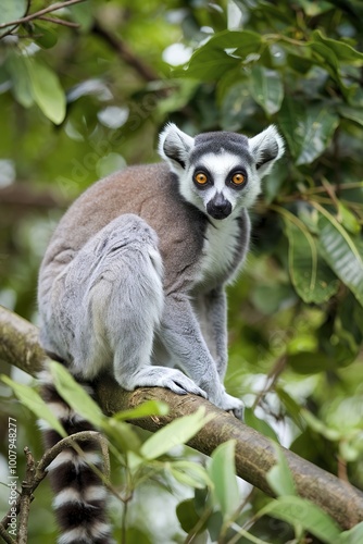 A gray lemur with large eyes and a long tail sitting on a tree branch in a lush green environment