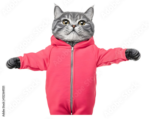 A gray tabby cat stands upright wearing a pink hooded jumpsuit arms outstretched against a plain white background.
