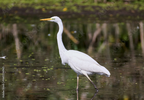 A great egret hunts on the lake.
