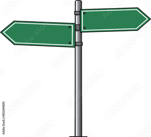 A green directional signpost with two blank arrow-shaped signs pointing in opposite directions, mounted on a metal pole.