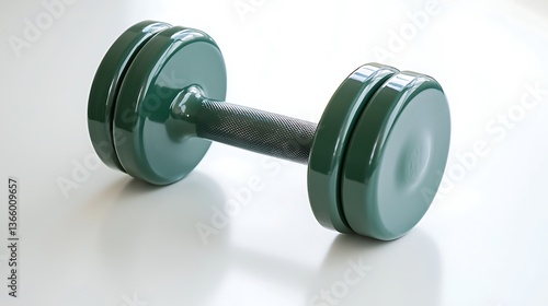 A green dumbbell is on a white table